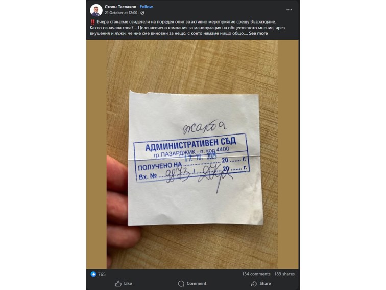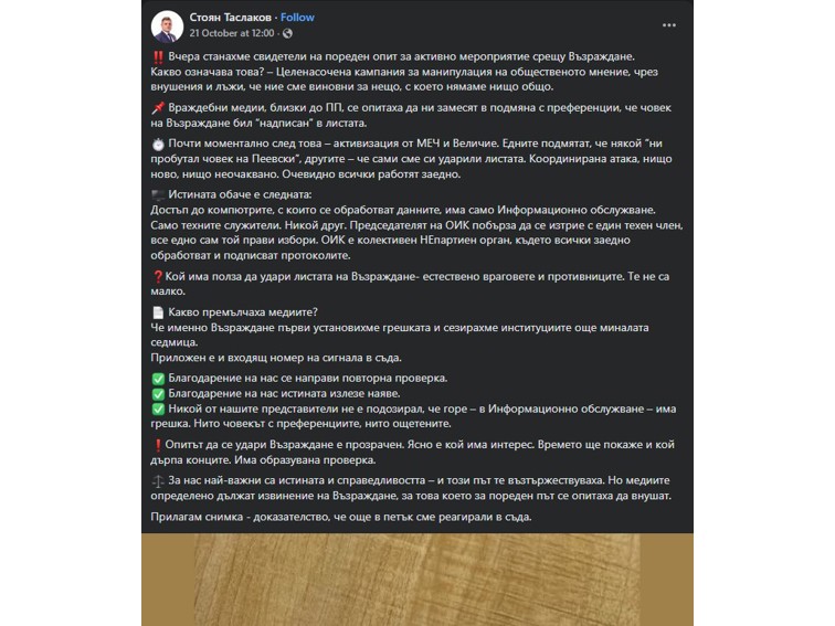 Народният представител Стоян Таслаков твърди, че „Възраждане“ разкрила изборна измама в Пазарджик, но истината е обратна: жалба №1261/2025 е на тяхна кандидатка Ася Фиткина-Спасова, която си търси откраднатите 5 гласа от съпартиец! Член на ОИК от партията подаде оставка, ЦИК го освободи. Таслаков използва делото на своята съпартийка, за да се представи за герой. Лъжа, разкрита от съдебни документи!